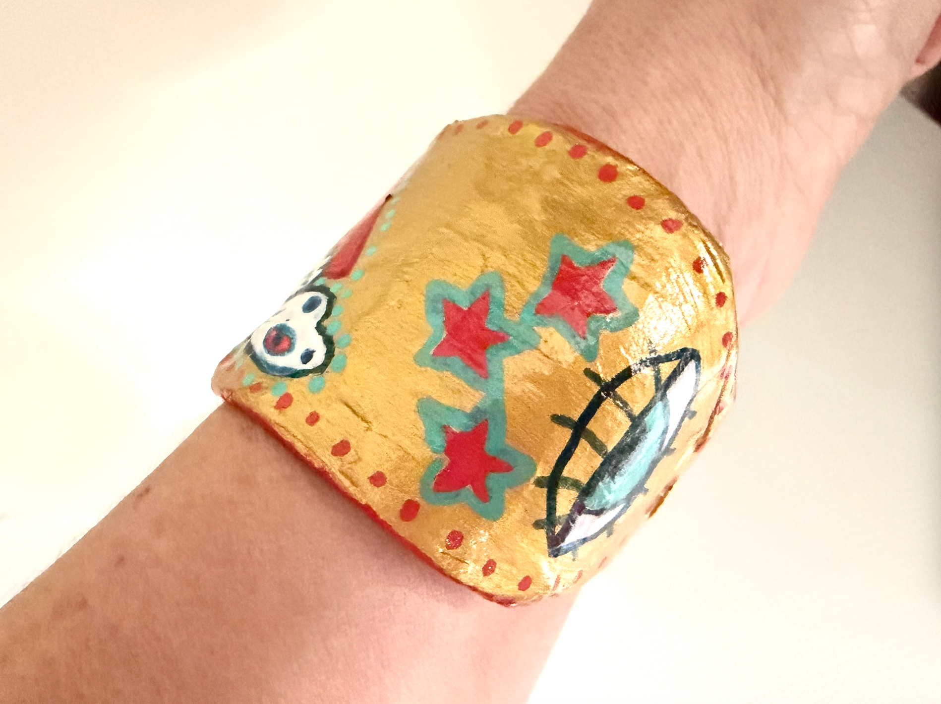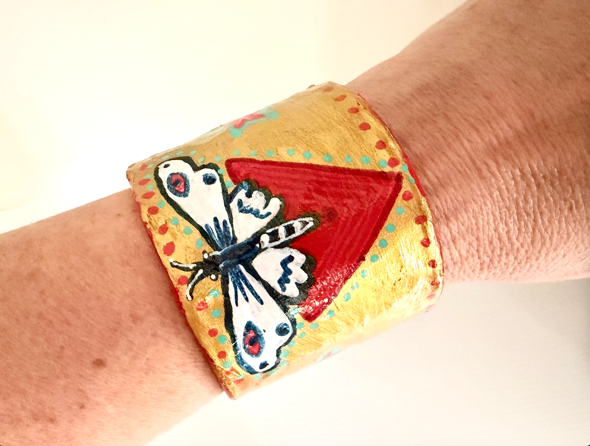 These cuffs honour Kali's playful, golden side. Painted in radiant gold with bold red, blue, and aqua details, and finished with a rich blue interior, they vibrate with sacred power.
