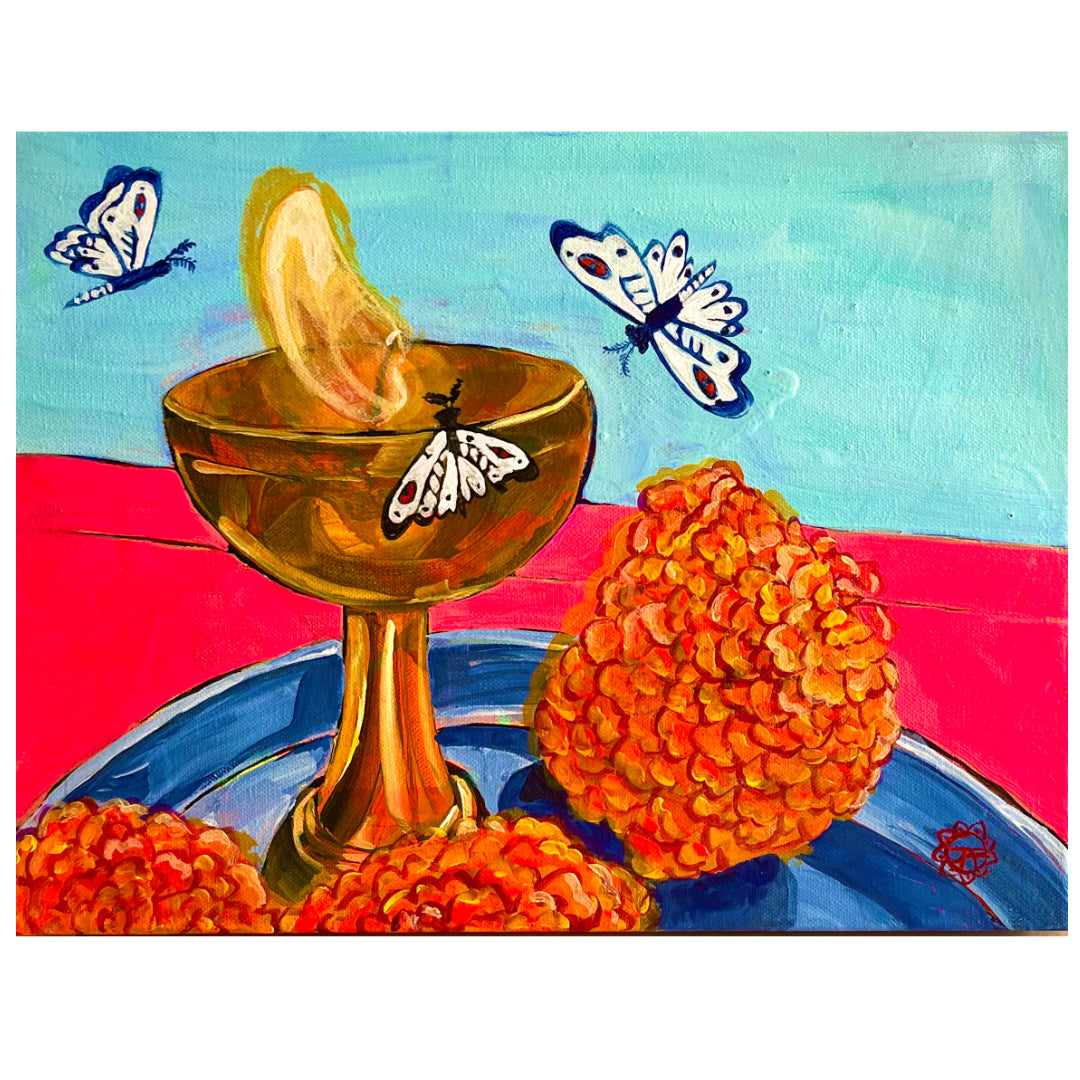A vibrant and symbolic piece of contemporary sacred art, this work blends spiritual ritual, nature, and insight — a reminder of the beauty and mystery in simple moments of devotion.