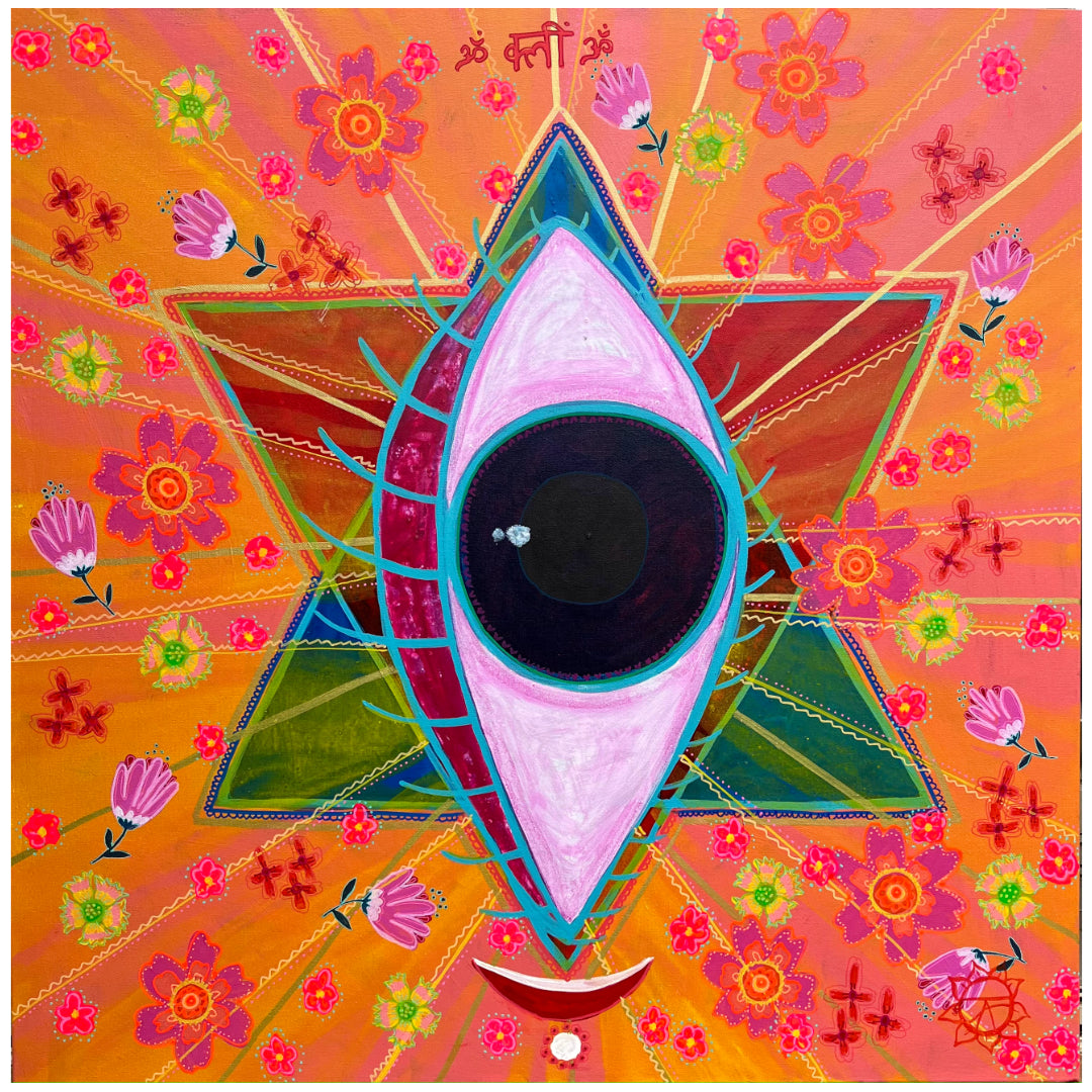 Om Kleem Om is bold, decorative, and alive with colour and meaning. A joyful piece of sacred feminine art, inviting connection through sound, symbol, and vision.